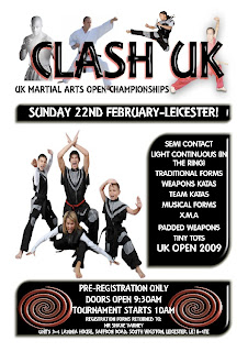 You are officially invited to the 1st Clash UK Open Martial Arts Championships to be held in leicester on sun feb 22nd, doors open at 9:30am we have over 85 divisions including semi contact, light continous in the ring, kata, team kata, weapons, musical and creative forms, please find attached the full information and please let me know if you can attend would be geat to see you there,