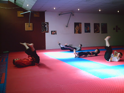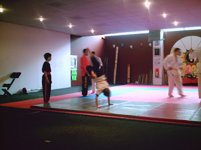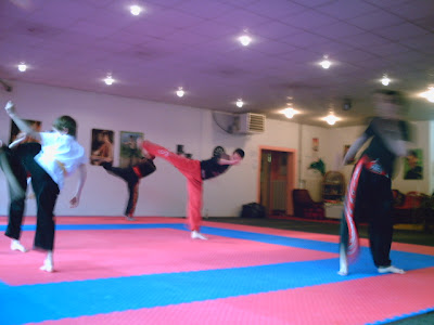 No popoldne pa smo začeli z bolj zahtevnimi elementi kot so kolesa in stranska kolesa brez rok, ter udareci iz skoka z obratom za 360 stopinj ali tako imenovani tunder kick, ter recimo cheat 360, ki je podoben udarec le,da delamo skok iz obrata z obemi nogami istočasno in kolena držimo visoko zdvignjena in še nekatere druge.